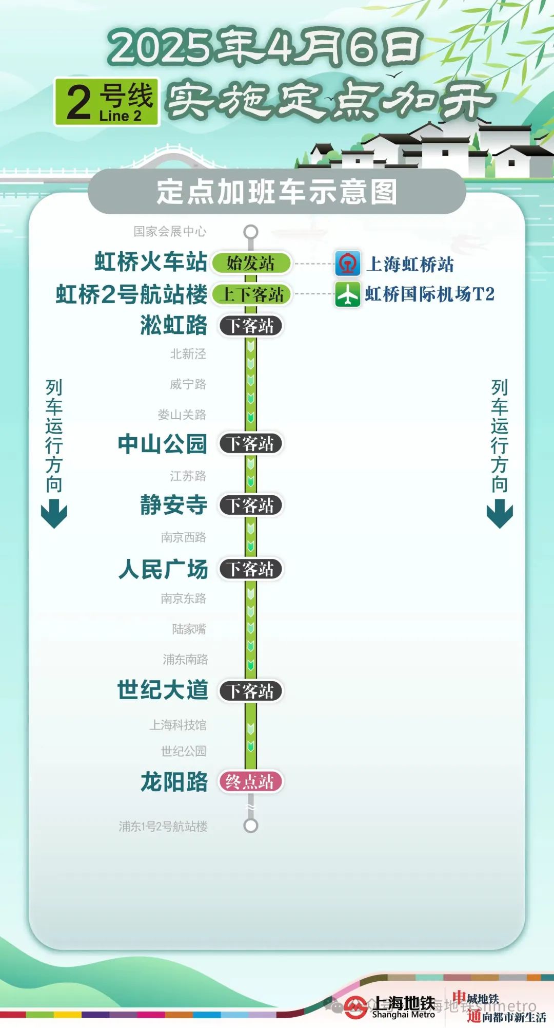 2號線在虹橋火車站常態定點加班車(23:30)的基礎上加開2班定點加班車。加班車沿途停靠虹橋火車站站、虹橋2號航站樓站、淞虹路站、中山公園站、靜安寺站、人民廣場站、世紀大道站、龍陽路站(終到站),其餘車站不停靠。停靠車站中,虹橋火車站站(始發站),虹橋2號航站樓站可上下客,其餘車站只下不上,途經換乘站不可換乘。