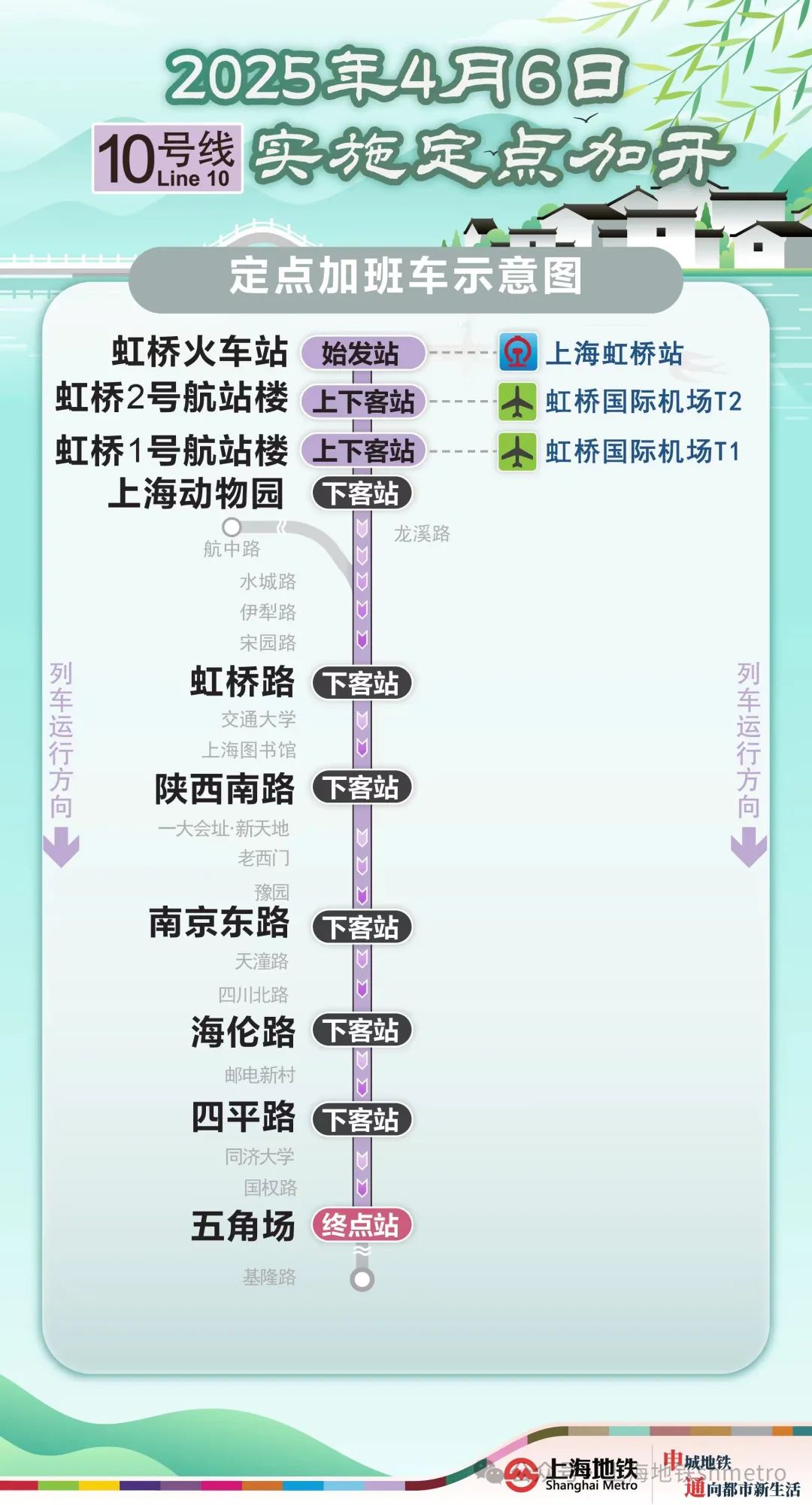 10號線在虹橋火車站站常態定點加班車(23:00)後加開4列定點加班車,加班車停靠虹橋火車站站、虹橋2號航站樓站、虹橋1號航站樓站、上海動物園站、虹橋路站、陝西南路站、南京東路站、海倫路站、四平路站、五角場站(終點站),其餘車站不停靠。停靠車站中,虹橋火車站站(始發站),虹橋2號航站樓站、虹橋1號航站樓站可上下客,其餘車站只下不上。