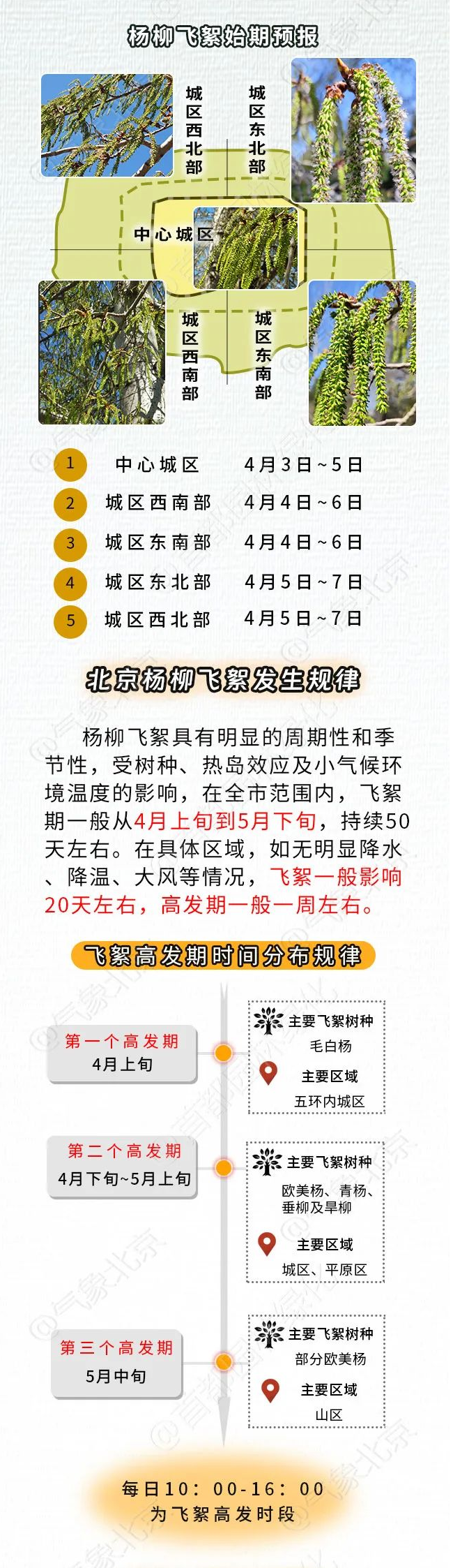 *中國氣象局公共氣象服務中心高級工程師 任俐文:*大體上每年3月下旬至5月上旬是飛絮的高發時段,春季氣温回升期以及晝夜温差大的晴日是觸發飛絮的主要氣象條件。當日平均氣温一般穩定連續三天以上超過15℃,特別是日最高氣温超過25℃,且日照達到6小時以上時,陽光促進植物的光合作用和果實成熟,有利於楊樹、柳樹的雌株果實成熟,開裂釋放飛絮。在春季的晴朗天氣裏,夜間氣温低,白天升温高,就會加速飛絮釋放,加上較低的相對濕度和1至3級的微風這些條件,將更有利於飛絮飄散。