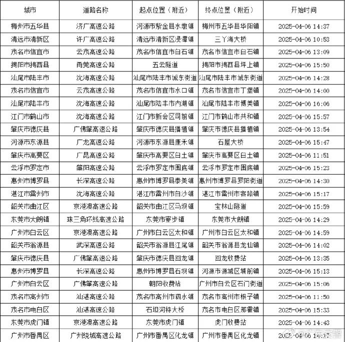 據@廣東交警,截至4月6日17時,全省高速通行緩慢長度超過5公里,時間超過30分鐘的點段共25個,在河源市(1)、茂名市(4)、韶關市(2)、清遠市(1)、肇慶市(3)、廣州市(3)、江門市(1)、雲浮市(1)、惠州市(2)、揭陽市(1)、湛江市(1)、東莞市(2)、汕尾市(2)、梅州市(1)。