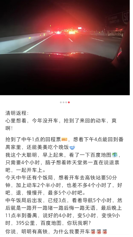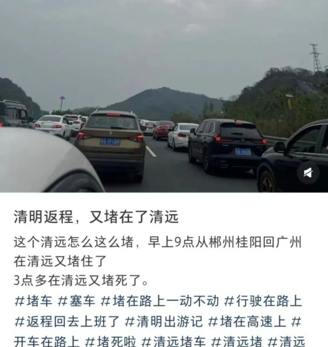 “早上9點從郴州回廣州,下午3點多在清遠堵住了”