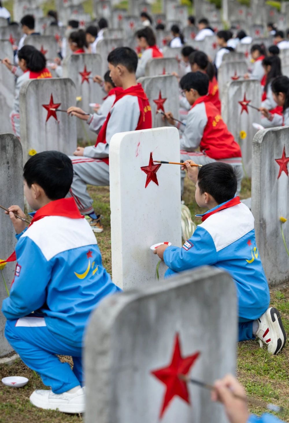 清明時節,細雨如織。悠揚的《思念曲》在山間迴盪。四川通江縣沙溪鎮中心小學的學生們蹲在烈士墓前,握着毛筆,一筆一筆為碑上的五角星描紅……幾十年來,每到這個時候,都有無數的人前來祭拜革命先烈。