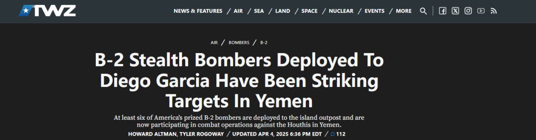 據美國“動力”網站“戰區”頻道4日報道,一名美國官員透露,在最近空襲胡塞武裝的行動中,美國空軍已經出動了部署於迭戈加西亞的B-2隱形轟炸機。美國商業衞星公司“行星實驗室”4月2日拍攝的最新衞星照片顯示,該基地停放了至少6架B-2和6架KC-135。目前B-2是唯一能夠掛載3萬磅級GBU-57/B“掩體破壞者”巨型鑽地炸彈的美軍戰機,可用於打擊胡塞武裝的地下網絡。不過報道承認,去年美軍也曾動用隱形轟炸機空襲胡塞武裝,但效果不明。目前也不確認最近B-2空襲胡塞武裝時是否使用了鑽地炸彈。