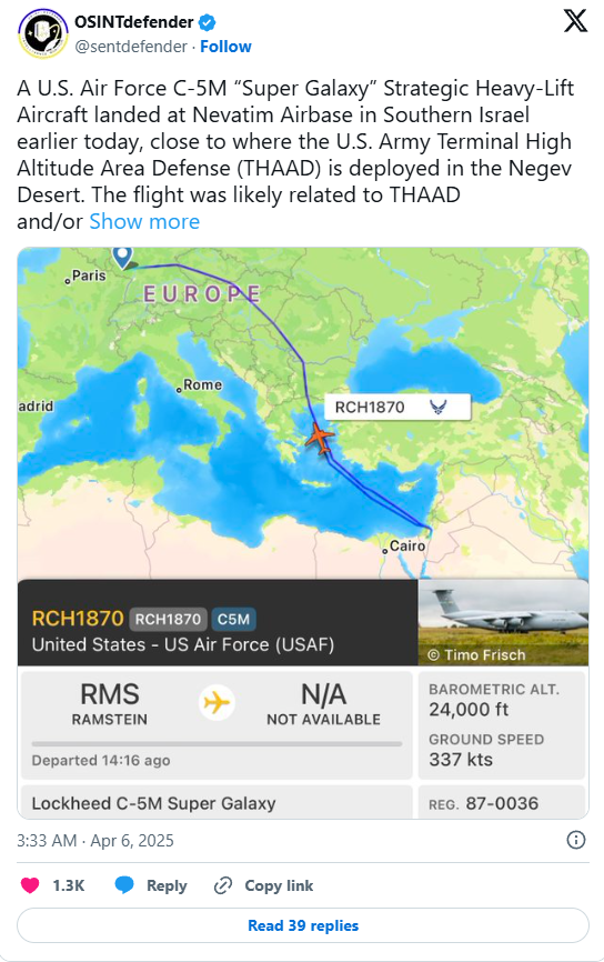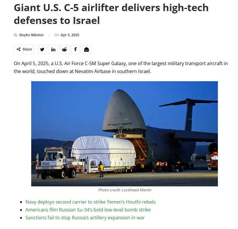 “保加利亞軍事”網站稱,開源情報顯示,4月5日,美國空軍一架C-5M“超級銀河”運輸機從德國拉姆施泰因空軍基地出發,降落在以色列南部的內瓦蒂姆空軍基地。消息人士透露,這架運輸機就是執行向以色列運送“薩德”反導系統的任務。該反導系統由洛克希德·馬丁公司研製,號稱是“唯一可以在大氣層內和大氣層同時實施攔截的反導系統”,最大攔截高度達150公里。相比美軍和以色列裝備的其他末段反導系統,“薩德”系統的作戰高度更高,並且能擊落速度更快的威脅,主要針對的就是射程在1500-3000公里左右的中程彈道導彈。一套典型的“薩德”系統由移動火控和指揮控制中心、地面AN/TPY-2遠程X波段雷達和最多9輛發射車組成,每輛發射車攜帶有8枚攔截導彈,理論上可以快速引導72枚導彈同時攔截36個來襲目標。