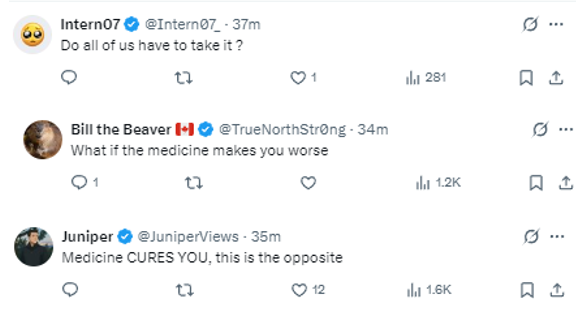 有網友説,“我們所有人都得吃它(這個藥)嗎?”“如果藥物使你的病情加重怎麼辦?”“藥物治癒你,(但)這是相反的(作用)。”↓