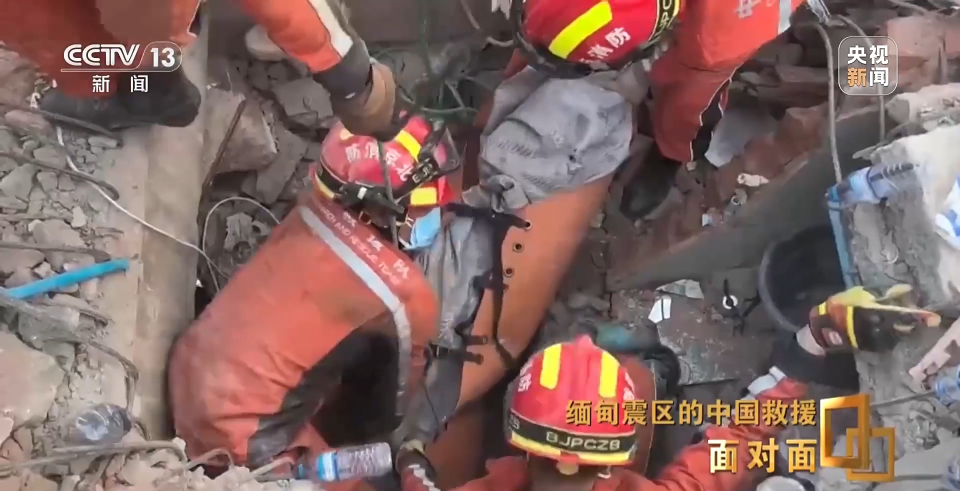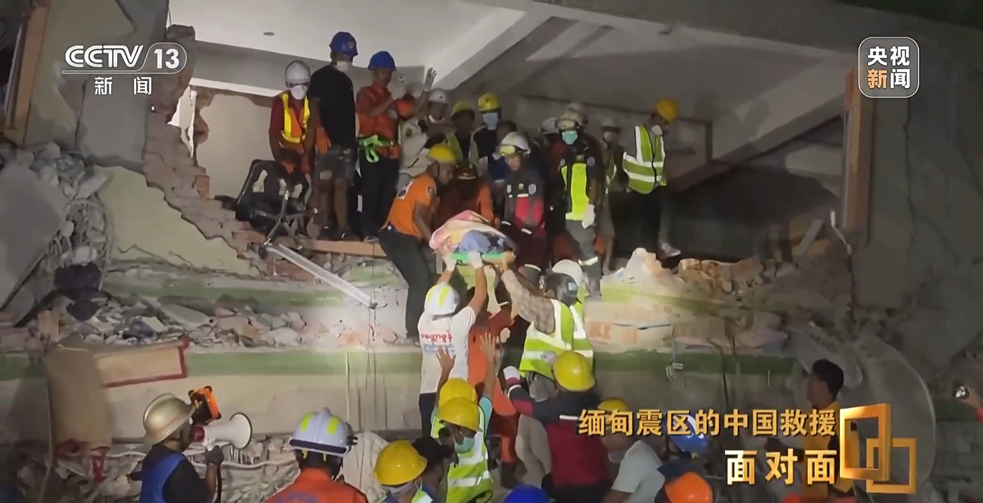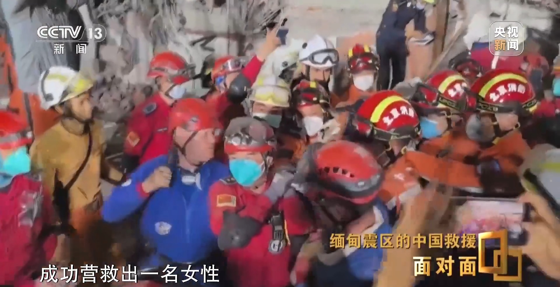 *總枱央視記者 張騰飛:*在3月31日當地時間凌晨的零點四十分,我們現在是在曼德勒市的長城飯店救援點,在現場我們看到,經過5個多小時的努力,中國救援隊是在這片廢墟中成功營救出一名女性,目前她的生命體徵良好,此前她在這裏被困超過60個小時,這也是中國救援隊抵達受災最嚴重的曼德勒市成功營救出的第一名倖存者。