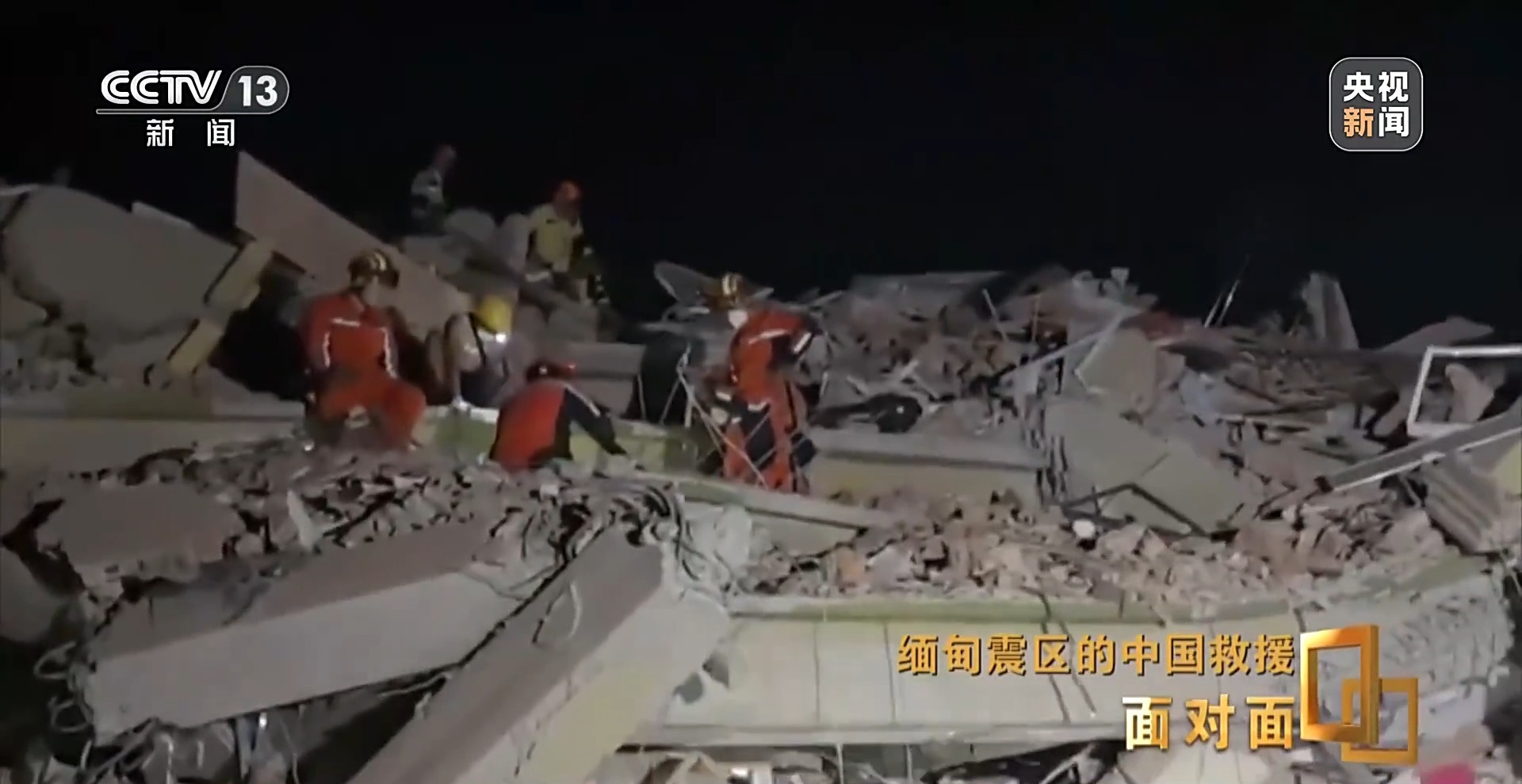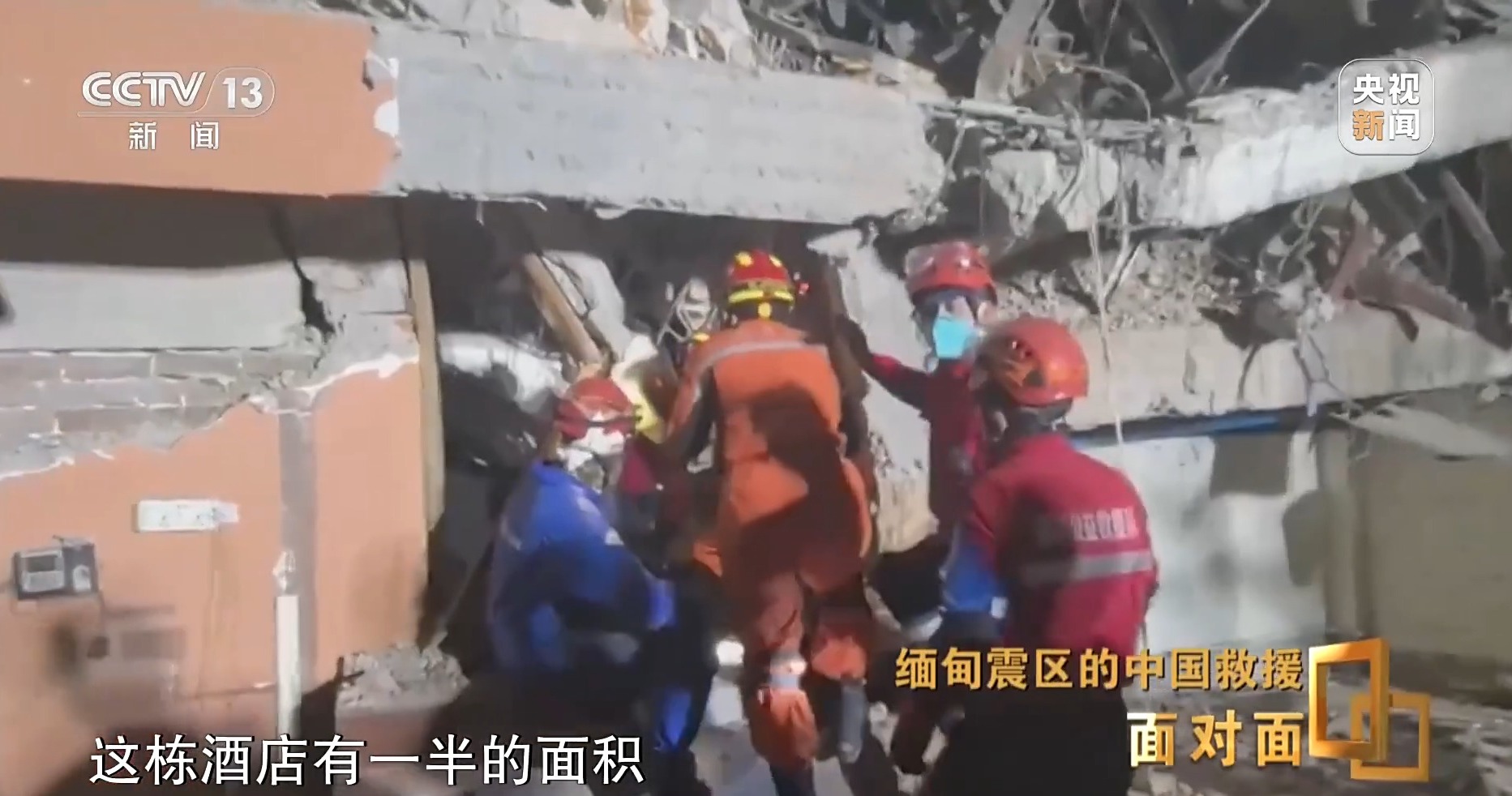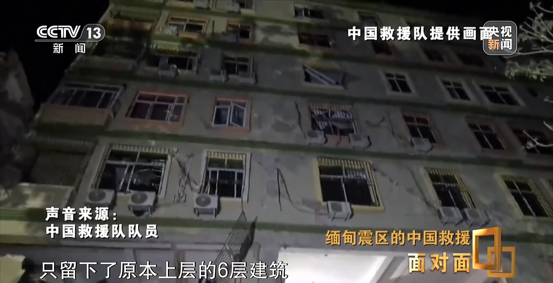 *總枱央視記者 張騰飛:*現在是緬甸時間晚上的七點半,我們跟隨中國救援隊的先遣隊來到了當地被稱為長城飯店的地方,通過現場我們看到,受這次強震的影響,這棟酒店有一半的面積都出現了嚴重傾斜,而且特別是底層,出現了粉碎性坍塌。
