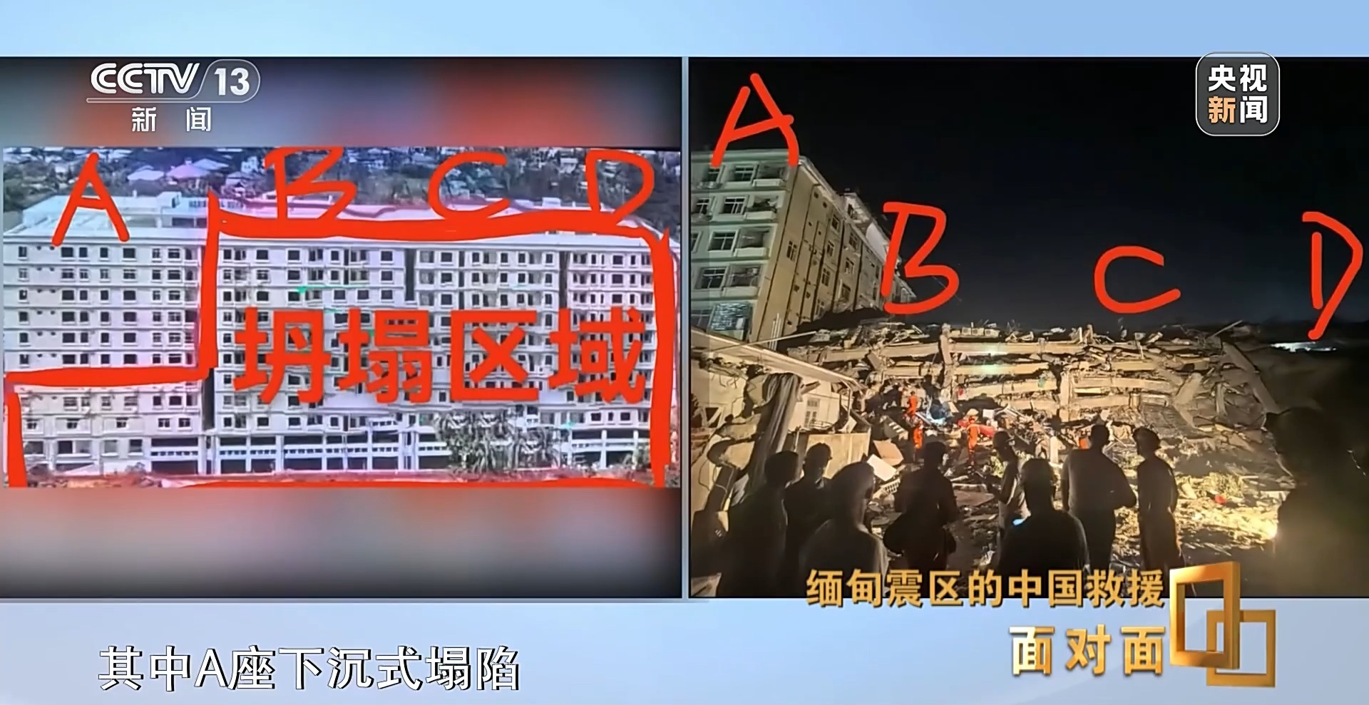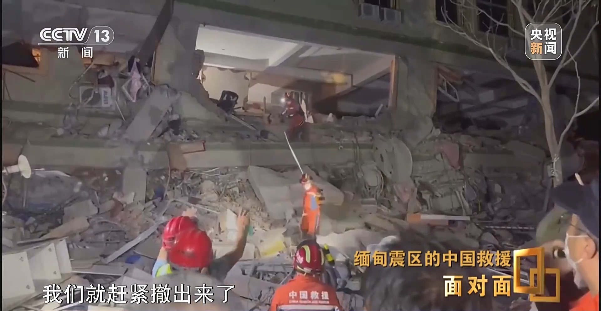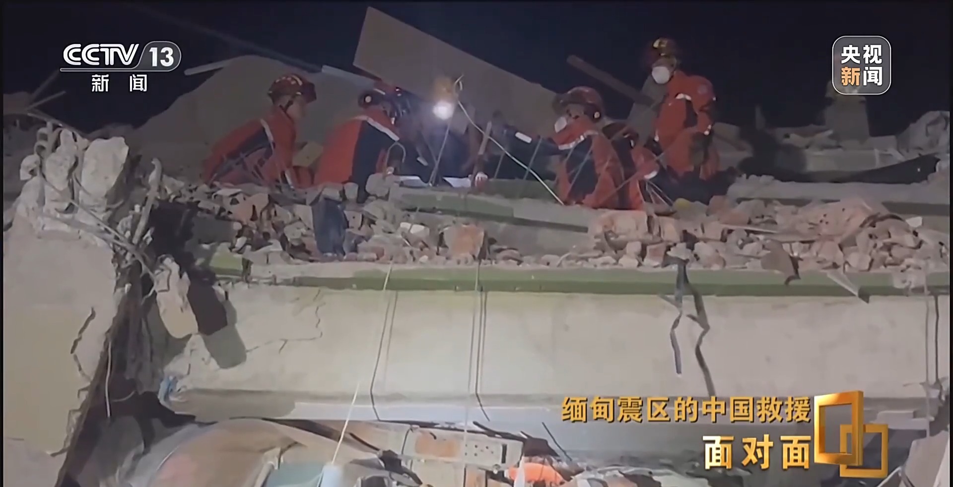 *總枱央視記者 張騰飛:*現在是緬甸時間晚上的七點半,我們跟隨中國救援隊的先遣隊來到了當地被稱為長城飯店的地方,通過現場我們看到,受這次強震的影響,這棟酒店有一半的面積都出現了嚴重傾斜,而且特別是底層,出現了粉碎性坍塌。