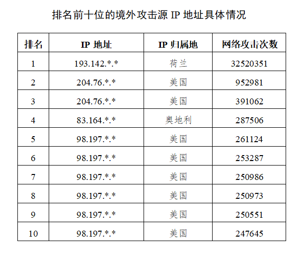 二是攻擊行為呈現出高度組織化。 數據顯示,本次事件中,除美國外,荷蘭等國IP地址也參與攻擊。值得注意的是,荷蘭單個IP對黑龍江省關鍵信息基礎設施的攻擊次數高達3252萬次,而美國則通過分散IP實施高頻攻擊,體現出高度的組織化特徵。
