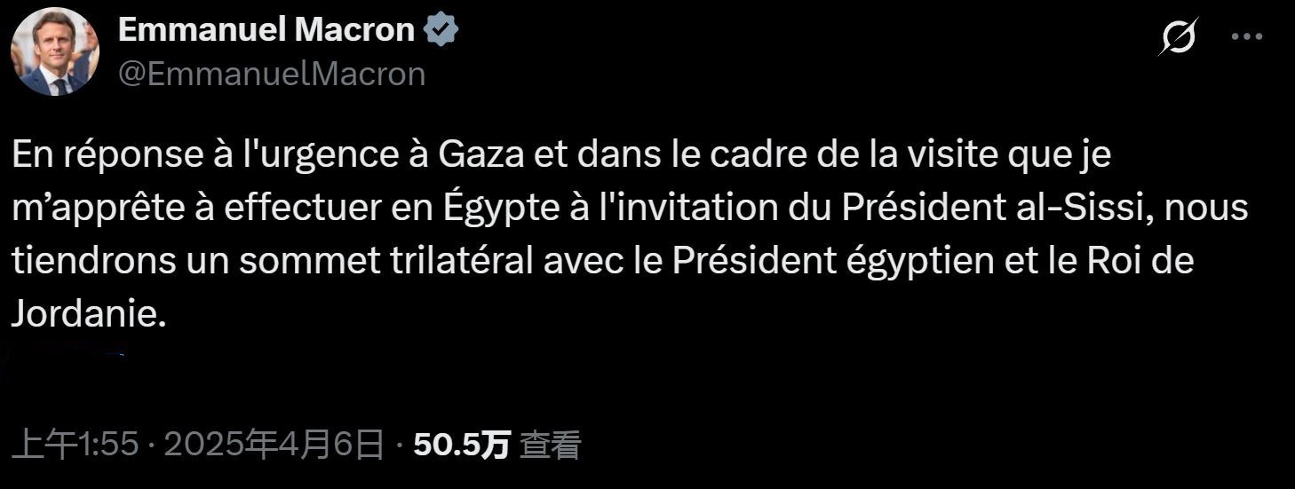 馬克龍日前在社交媒體上發表聲明稱,在訪問埃及期間,他將參加4月7日在開羅舉行的埃及、法國和約旦三方峯會。