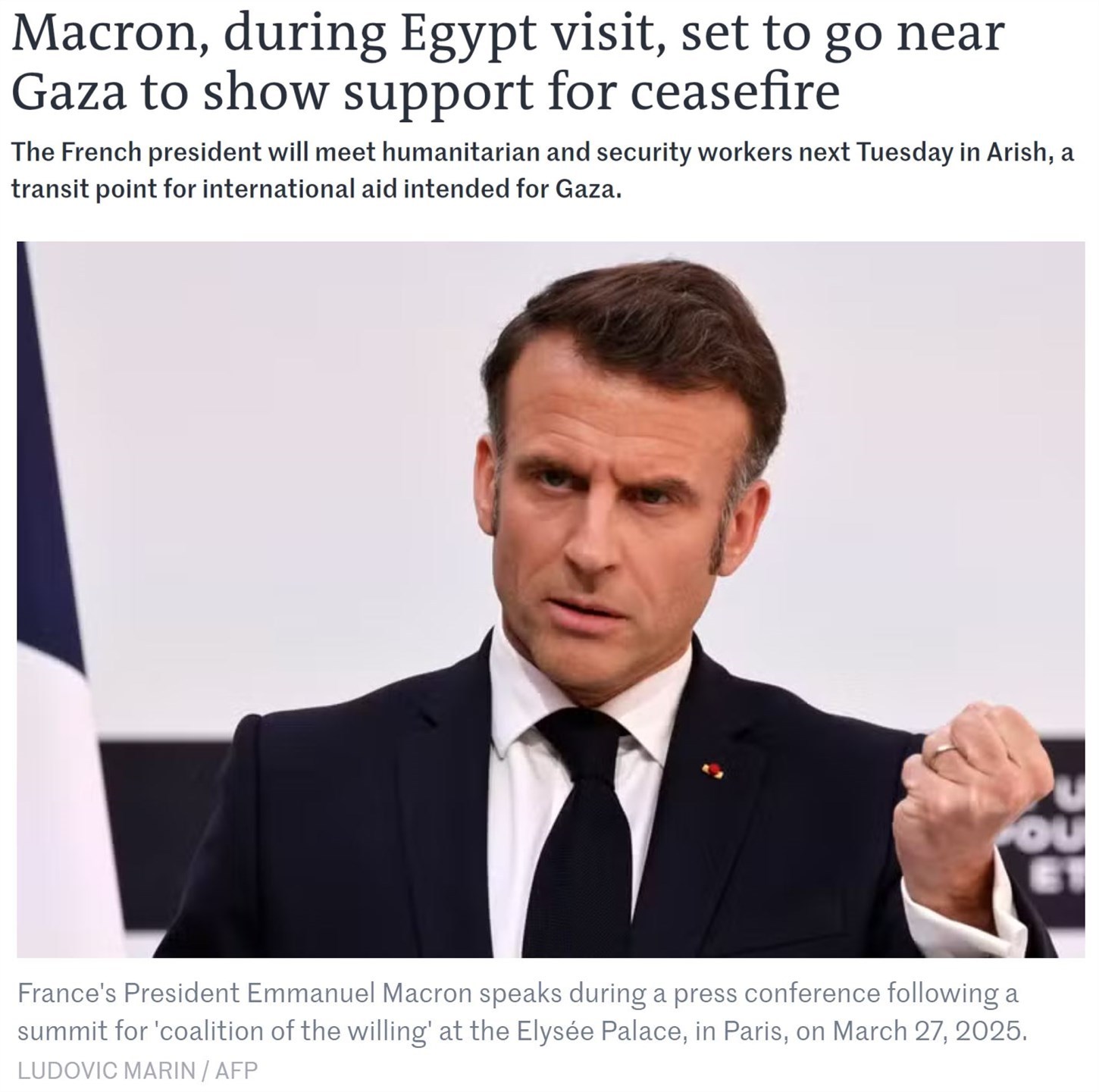馬克龍計劃8日訪問加沙地帶附近的埃及北西奈省首府阿里什市。阿里什距離加沙地帶50公里,是針對加沙的國際援助物資的過境點之一。