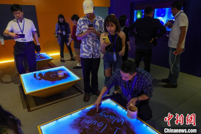 4月6日,參加“僑”見海南自貿港主題活動的12國30位海外網絡華媒人士、僑領僑青、知名網紅探訪萬寧M1咖啡奇幻工場。圖為嘉賓體驗用咖啡渣創作沙畫。中新網記者 駱雲飛 攝