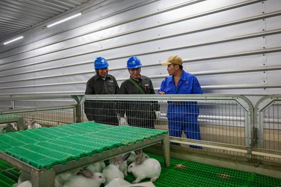 The picture shows power supply service personnel learning about the electricity usage for meat rabbit farming, assisting customers with their electricity-related needs.