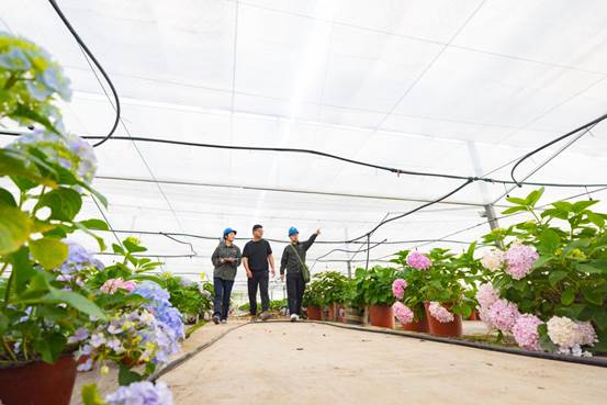 The picture shows power supply service personnel checking electricity usage at a flower planting base, helping customers resolve electricity-related issues.