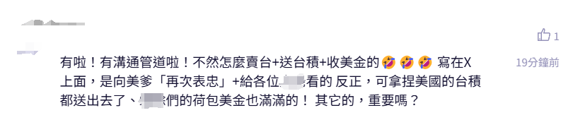 “有溝通管道啦!不然怎麼賣台+送台積+收美金的,寫在X上面,是向美爹‘再次表忠’+給各位民眾看的。反正,可拿捏美國的台積都送出去了、XX們的荷包美金也滿滿的!其它的,重要嗎?”