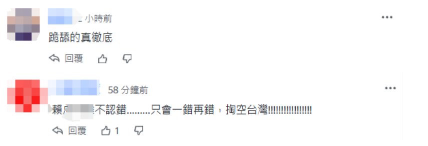 還有島內網友批評稱,“跪舔得真徹底”“賴不認錯……只會一錯再錯,掏空台灣!”