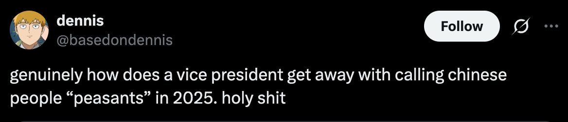 “説真的,2025年了,一個副總統怎麼還能稱中國人為‘鄉巴佬’呢”。↓