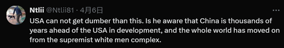 還有網友表示,“美國這番言論簡直愚不可及。他不清楚中國在文明發展上領先美國數千年嗎?全世界早已摒棄這種白人至上情結了”。↓