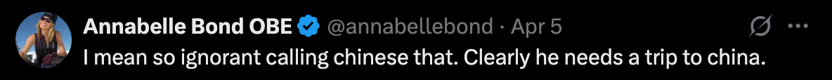 有人諷刺説,他所謂的“‘中國鄉巴佬’正享受着世界上最大的高鐵網絡、世界上最先進的電動汽車,他們生活在世界上最安全的國家之一,犯罪率很低,他們擁有更實惠、更好的醫療保健、更便宜的食品雜貨”。↓