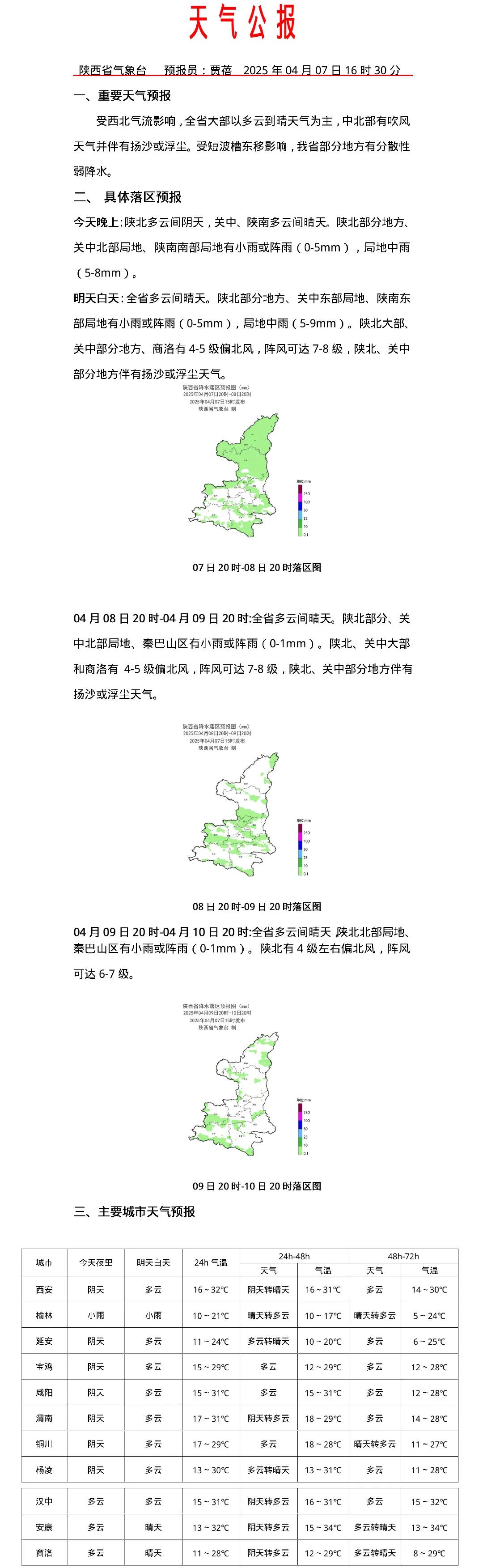 西安市氣象台2025年04月07日16時發佈天氣預報:
