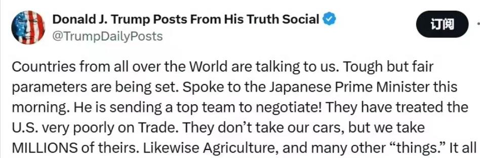 特朗普當天還在社交媒體上公佈了其與日本首相討論關税的消息,並堅稱日本在汽車貿易上佔了美國大便宜。隨後,特朗普也在當天與內塔尼亞胡的記者會上表態,他認為日本需要開放市場。