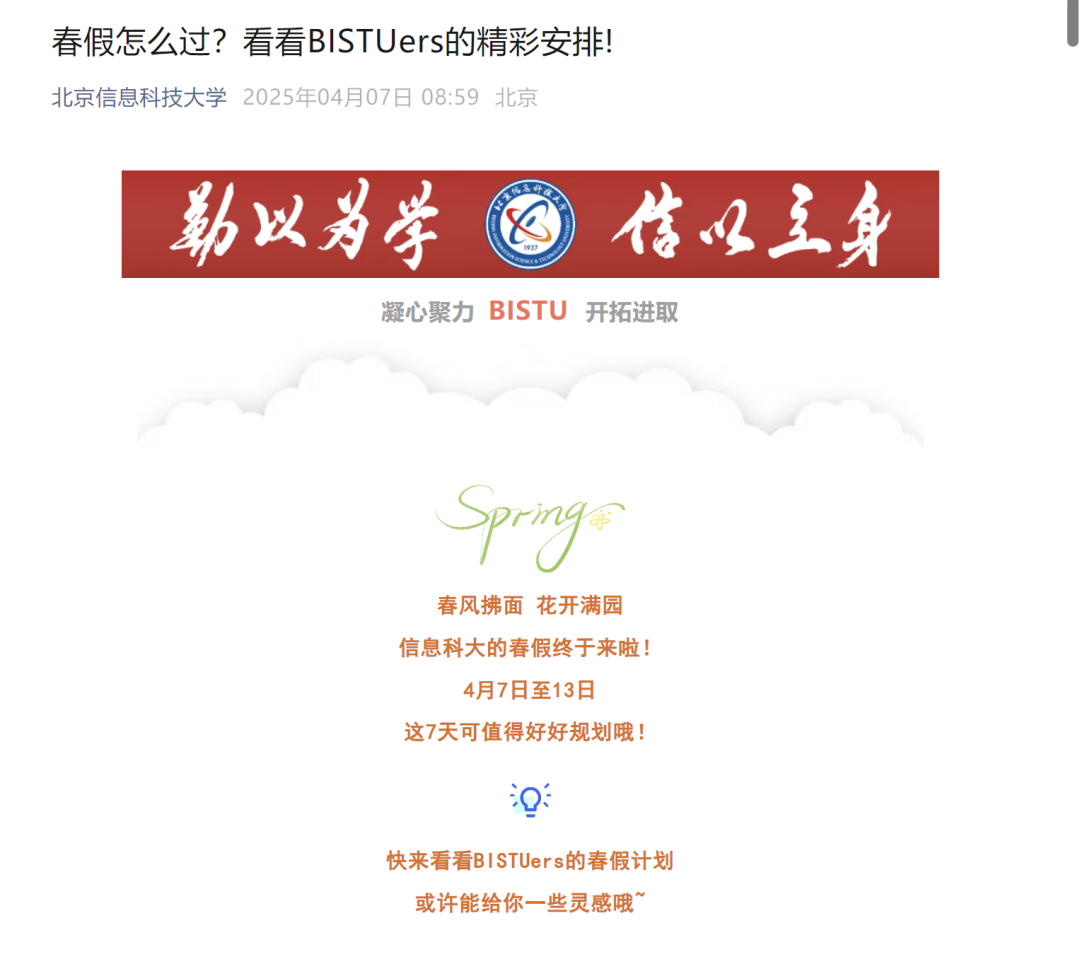 “我們鼓勵大學生充分利用和享受假期。放春假,不‘放羊’。”信息科大校長郭福説,“春假7天停課,不調課、不補課,目的是讓師生在繁重的學業和工作中有機會停一停腳步,引導學生全面發展,支持教師職業生涯可持續發展。”