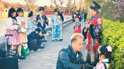 “10年前穿漢服上街會被圍觀,如今已很尋常。”00後大學生陳薇説。這背後有傳統文化復興的影響。隨着《國家寶藏》《唐宮夜宴》等文化節目熱播,年輕一代對傳統美學的認知從“博物館展品”轉變為“可穿戴的文化符號”。“在故宮紅牆下梳起兩把頭,在洛陽應天門披上唐制大袖衫,這些行為既是我們審美表達,也是一種文化認同。妝造體驗讓歷史從書本‘活’了過來,親身參與更能體會到文化傳承的責任感。”陳薇説。