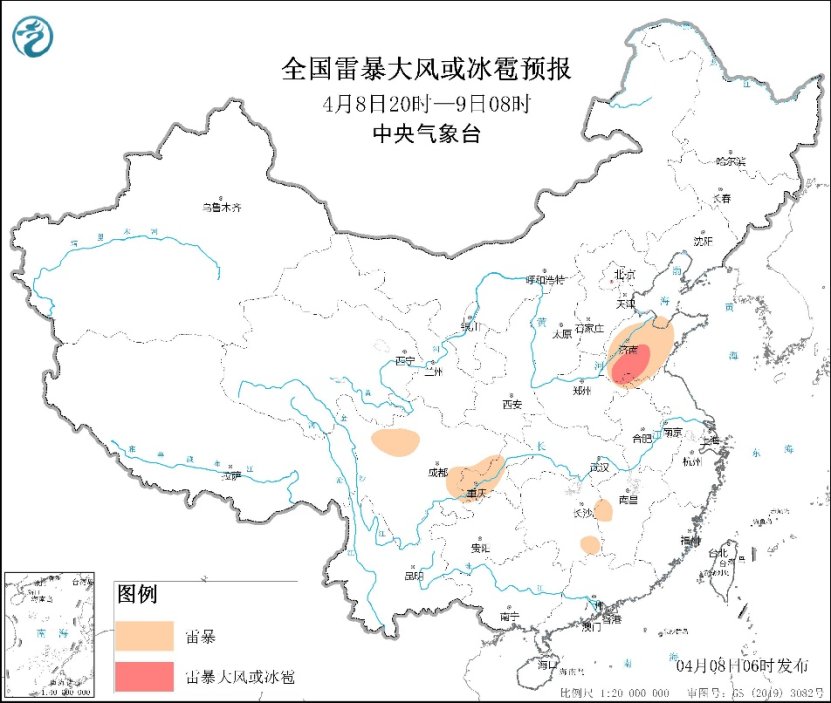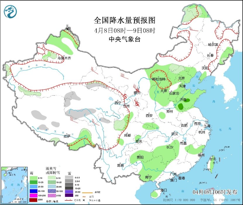 今明兩天,南北方均會有降水出現,預計華北、黃淮、貴州東部、江南及華南北部等地有小到中雨,部分地區有大到暴雨,局地伴有雷暴大風、短時強降水等強對流天氣。其中今天,山東中南部、河南東部、江蘇北部、安徽北部等地局地將有雷暴大風或冰雹天氣,山東南部等地局地還伴有短時強降水,請公眾注意關注當地氣象部門發佈的預報、預警信息,避免在強對流活躍時段外出。