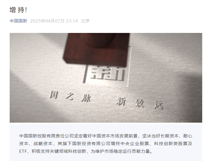 當日晚間,中國國新控股有限責任公司發佈公告,明確表示堅定看好中國資本市場發展前景,致力於成為長期資本、耐心資本與戰略資本。其旗下國新投資有限公司已着手增持中央企業股票、科技創新類股票及ETF,旨在積極支持關鍵領域科技創新,為維護市場穩定運行貢獻力量。