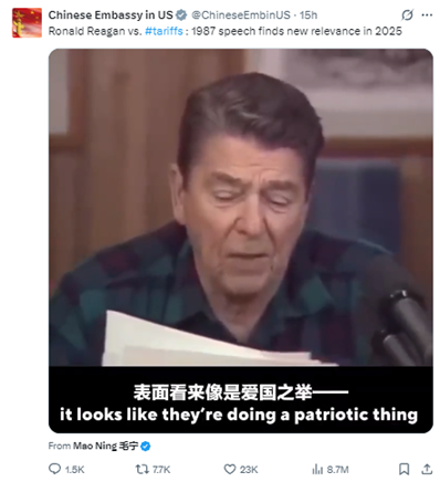 中國駐美大使館在上述視頻配文中稱,“羅納德·里根vs. 關税:1987年的演講在2025年找到了新的意義”。