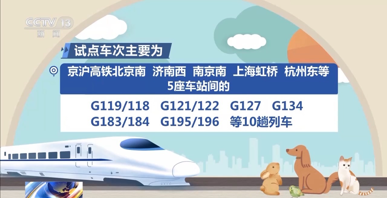 試點車次主要為京滬高鐵北京南、濟南西、南京南、上海虹橋、杭州東等5座車站間的G119/118、G121/122、G127、G134、G183/184、G195/196等10趟列車。