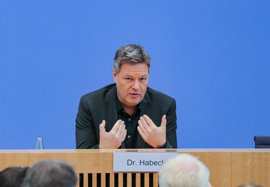 2月24日,在德國柏林,德國副總理兼經濟部長羅伯特·哈貝克出席新聞發佈會。新華社記者張帆攝
