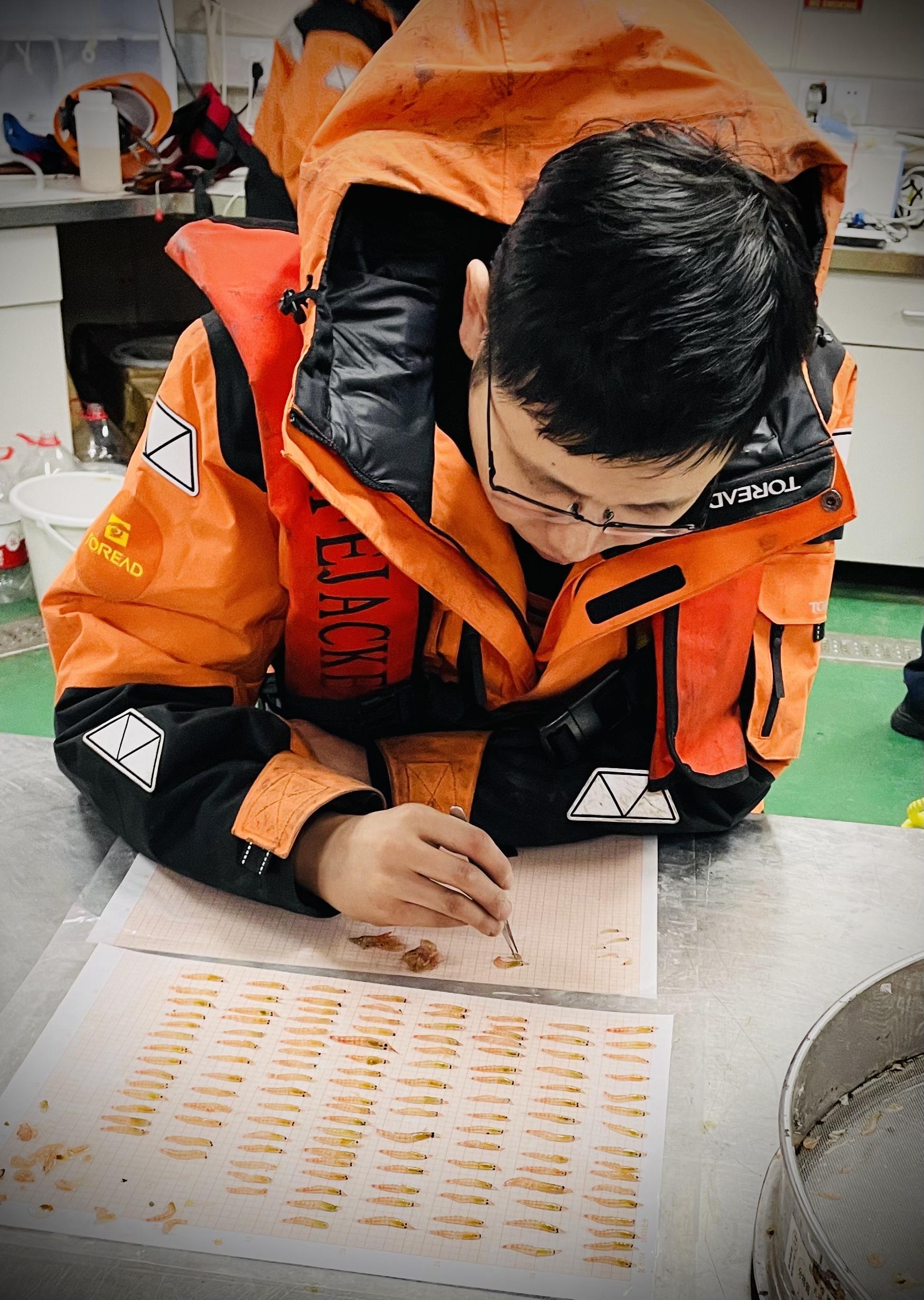 考察隊員測量磷蝦體長(周鵬/攝)