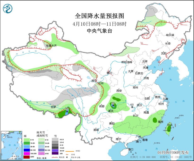 *4月10日08時至11日08時,*內蒙古東北部、新疆南疆盆地和南疆西部山區、西藏東部和南部、青海南部、甘肅河西、川西高原北部等地部分地區有小到中雪或雨夾雪。新疆北疆東部、西藏東南部、甘肅南部、四川盆地東部以及江漢西部、江南中南部、華南中北部、台灣島等地部分地區有小到中雨,其中,西藏東南部、重慶中部等地部分地區有大雨(25~45毫米)。內蒙古中東部、甘肅河西、寧夏北部、黑龍江東北部、遼東半島、山東半島等地部分地區有4~6級風(見圖3)。