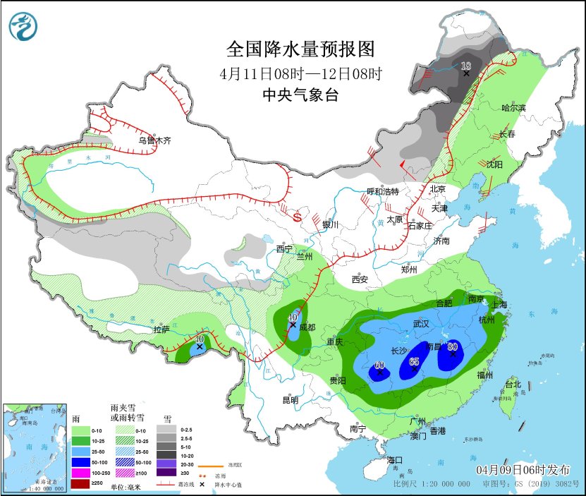 *4月11日08時至12日08時,*新疆南疆西部山區、內蒙古中東部、黑龍江西北部、西藏中北部、青海南部和西部、河北北部、川西高原北部等地部分地區有小到中雪或雨夾雪,其中,內蒙古東北部、黑龍江西北部等地部分地區有大雪,局地暴雪(10~18毫米)。西南地區東部、江漢、江淮西部、江南大部、華南北部等地部分地區有中到大雨,其中,湖南中西部和南部、江西大部、福建西北部、廣西北部等地部分地區有暴雨(50~80毫米)。內蒙古中東部、黑龍江西南部、吉林中部、遼寧中南部、甘肅河西、山西北部、河北中部、山東半島等地部分地區有5~6級風,陣風7~8級風(見圖4)。