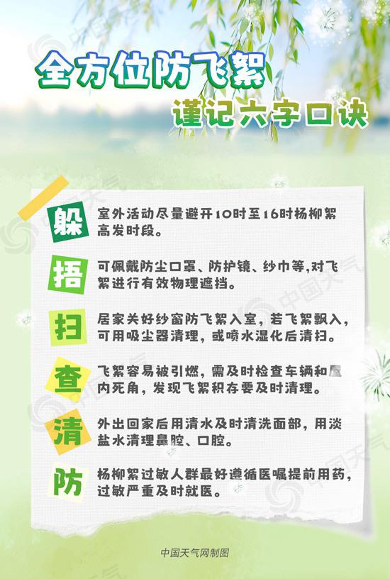 温馨提示,京津冀一帶楊柳絮即將進入盛飛期,公眾外出需做好防護,户外活動避開10時至16時飛絮最旺盛的時段,過敏體質尤其是哮喘病人遠離楊柳絮密集路段。若不慎飛絮入眼或沾上皮膚,應及時用水清理,切勿搓揉,過敏嚴重者及時就醫。此外,飛絮易燃且無孔不入,背風處極易造成楊柳飛絮聚集,需定期檢查及時清理,以防引發火災。