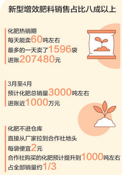 走進店面,一袋袋化肥靠牆堆起。“化肥熱銷期,每天能賣出60噸左右。”吳所懼翻找賬本中的記錄,“最多的一天賣了1596袋化肥,進賬207480元。3月到4月是一年中的旺季,預計化肥總銷量能有3000噸左右,進賬近1000萬元。”