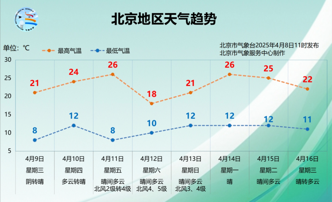 據北京市氣象局消息,預計本週末有明顯大風降温天氣,週五開始風力逐漸加大,雙休日也都是“大風”控場,氣温明顯下降。請大家及時關注臨近預報預警信息,提前做好防範。預計4月9日至4月16日,白天最高氣温18~26℃,夜間最低氣温8~12℃。