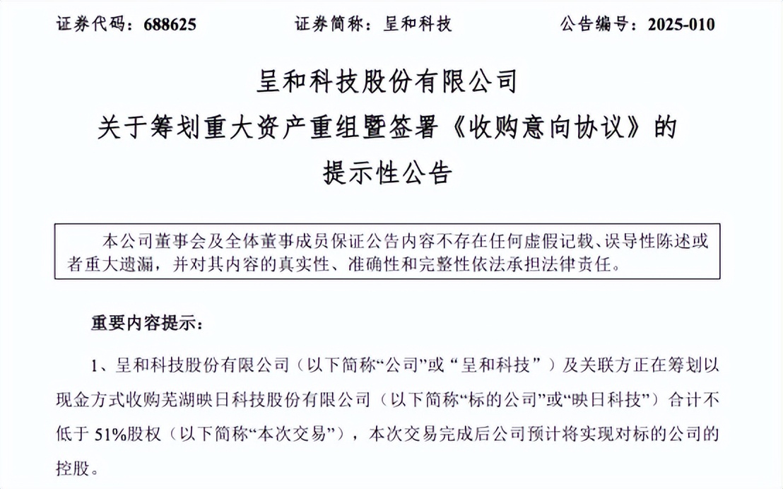 【環球網財經綜合報道】4月8日晚間,呈和科技(688625)發佈公告稱,公司及關聯方正在籌劃以現金方式收購蕪湖映日科技股份有限公司(以下簡稱“映日科技”)合計不低於51%的股權。本次交易完成後,呈和科技預計將實現對映日科技的控股,且該交易預計將構成重大資產重組,但不會導致公司控制權的變更。
