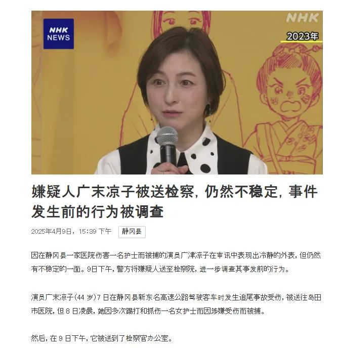 4月9日,據中新文娛消息,4月8日,44歲的日本女演員廣末涼子襲擊護士被警方逮捕。今天下午,警方將廣末涼子送至檢察院,並進一步調查其事發前的行為。