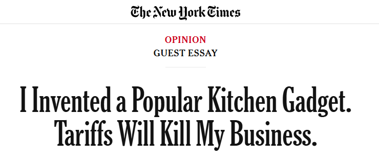 《紐約時報》網站近期發佈了一個美國廚用小工具企業負責人雷納的文章,講述加徵關税對他業務的影響。