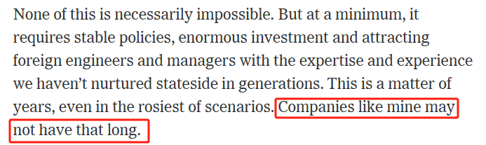 在作者看來,要實現以上在美國生產的圖景,需要有穩定的政策、巨大的投資,且能吸引不光有專業知識更有經驗的外國工程師和管理人員。並且,即使在最樂觀的情況下也需要數年才能實現上述情形。而許多像自己這樣的小公司,“可能不會有那麼長時間”了。