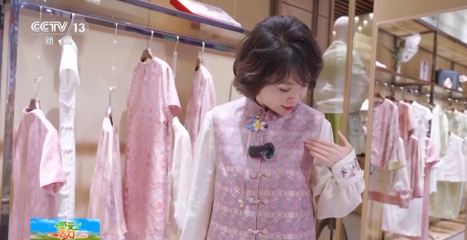 看!妙然把春天穿在了身上,這五個淡粉色的花瓣就是海棠,海棠配海棠是不是特別好看?這件衣服,出自天津老美華服裝開發部設計師李虎之手。
