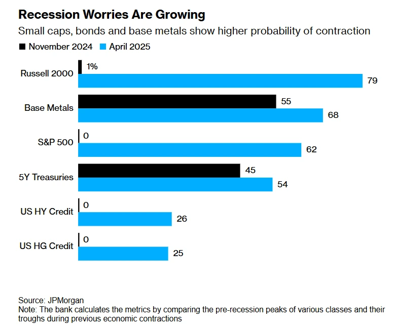 美國最大投行摩根大通4月8日表示,以小型股為主的羅素2000指數在近期的大跌中受到重創。該指數目前認為經濟衰退的可能性為79%。而在去年11月份,美國大選剛剛塵埃落定之時,這一指數預測的衰退可能性只有1%。