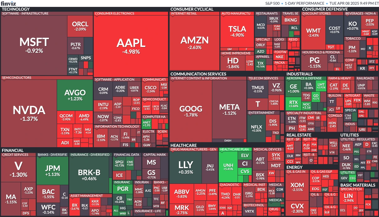 既然是黑手黨做派,白宮自然不會考慮市場會怎麼想。4月8日,美國三大股指均經歷了從暴漲到暴跌的劇烈震盪。標普 500 指數和納斯達克指數當天震盪幅度都超過了6%。
