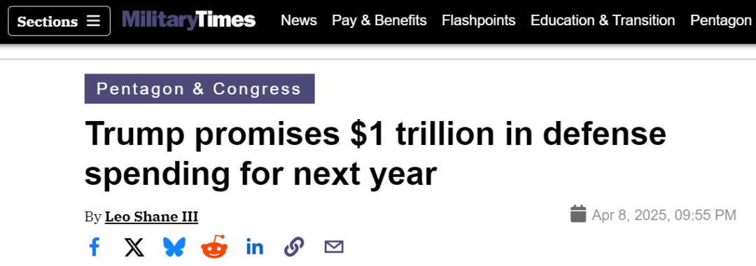 美國《軍事時報》8日稱,2025財年的美國軍費預算為8920 億美元,1 萬億美元意味着將在此基礎上增加近 12%,這與特朗普此前的表態截然不同。之前美軍正為削減8%的軍費預算而努力,赫格塞斯還計劃在全球範圍內裁減數萬名部門文職人員,並整合國內外的基地,以節省開支。