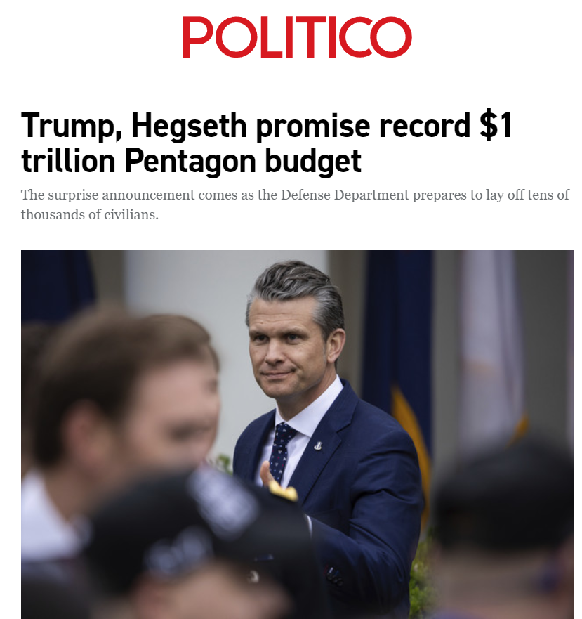 美國“政治”新聞網站7日稱,特朗普在與訪美的以色列總理內塔尼亞胡舉行的新聞發佈會上表示,即將公佈的美國國防預算“接近”1萬億美元。特朗普表示,“我們必須建設我們的軍隊。雖然我們非常注重節省成本,但必須建設軍隊。”他還稱,美國必須強大起來,因為外面有“許多壞勢力”。赫格塞思隨後也在社交平台上發文稱,“即將發佈:首個1萬億美元國防部預算。特朗普總統正在重建我們的軍隊,並且速度很快。”