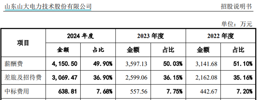 此外,山大電力的銷售費用支出金額很高,2024年金額達8794.73萬元,相當於同年淨利潤的三分之二;在公司的銷售費用中,差旅及招待費金額就超過了3000萬元。截至2024年末公司的銷售人員人數為99人,以此計算公司的銷售人員人均支出差旅及招待費金額高達30萬元。對於一家銷售客户主要在省內的企業,發生如此高金額的差旅及招待費是否合理,公司同樣未予回應。