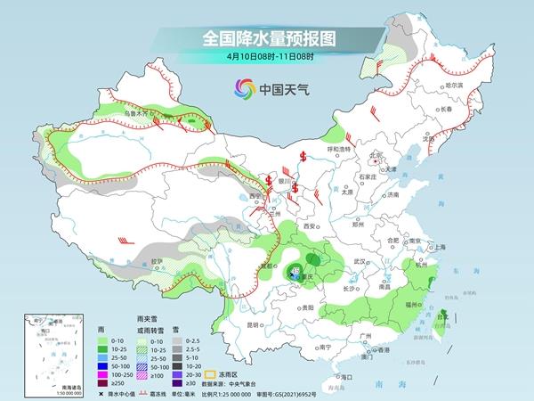 明天(4月11日)起,較強冷空氣將影響中東部大部地區,氣温下降6℃至10℃,部分地區降幅可達12℃至16℃。降温的同時,華北等地大風顯著,陣風8至10級,局地或可達11級以上。另外,內蒙古中東部、東北地區部分地區有中到大雪或雨夾雪,局地暴雪或大暴雪,南方降雨增強,將迎今年來最大範圍強對流天氣。