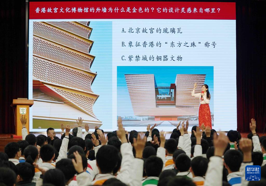 “同學們,你們知道香港故宮文化博物館的外牆為什麼是金色的嗎?”在香港培僑中學的禮堂裏,前來授課的人大附中分校教師高維陽拋出問題,課堂氣氛活躍了起來。